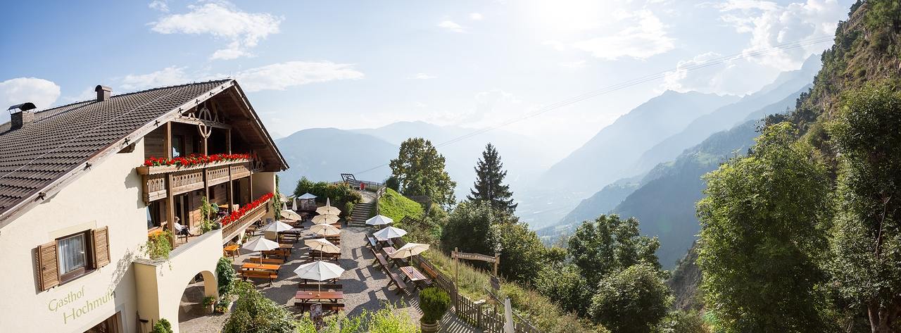 Was für eine Wucht! Der Ausblick von unserer Panoramaterrasse ist wirklich einmalig. Nicht nur Dorf Tirol, Meran und das Etschtal hat man von hier oben im Auge. Der Blick reicht bis zum Ifinger, den Sarntaler Alpen, der Ortlergruppe und sogar den weltberühmten Dolomiten. Da kann man vor lauter Staunen schon mal fast das Essen vergessen?